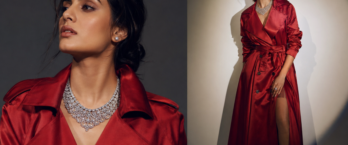 For the first cover, Priyanka wore a red silk-satin trench dress from Givenchy — a bold, architectural piece that commands attention. The ensemble features wide notch lapel collars, a deep V neckline, a drop shoulder design, full-length bell sleeves, a front slit, and a matching ribbon tie at the waist. Side pockets add a touch of insouciant elegance to an otherwise dramatic silhouette.